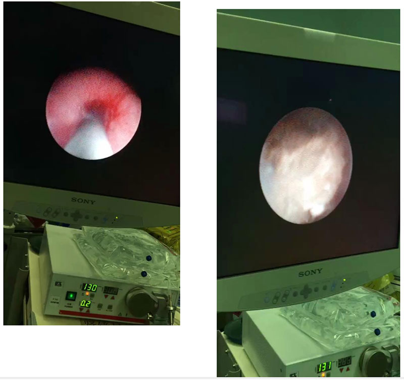 ? 沿導(dǎo)絲上輸尿管鏡,找到結(jié)石或狹窄處;或用輸尿管鏡邊沖水推開粘膜,邊上鏡